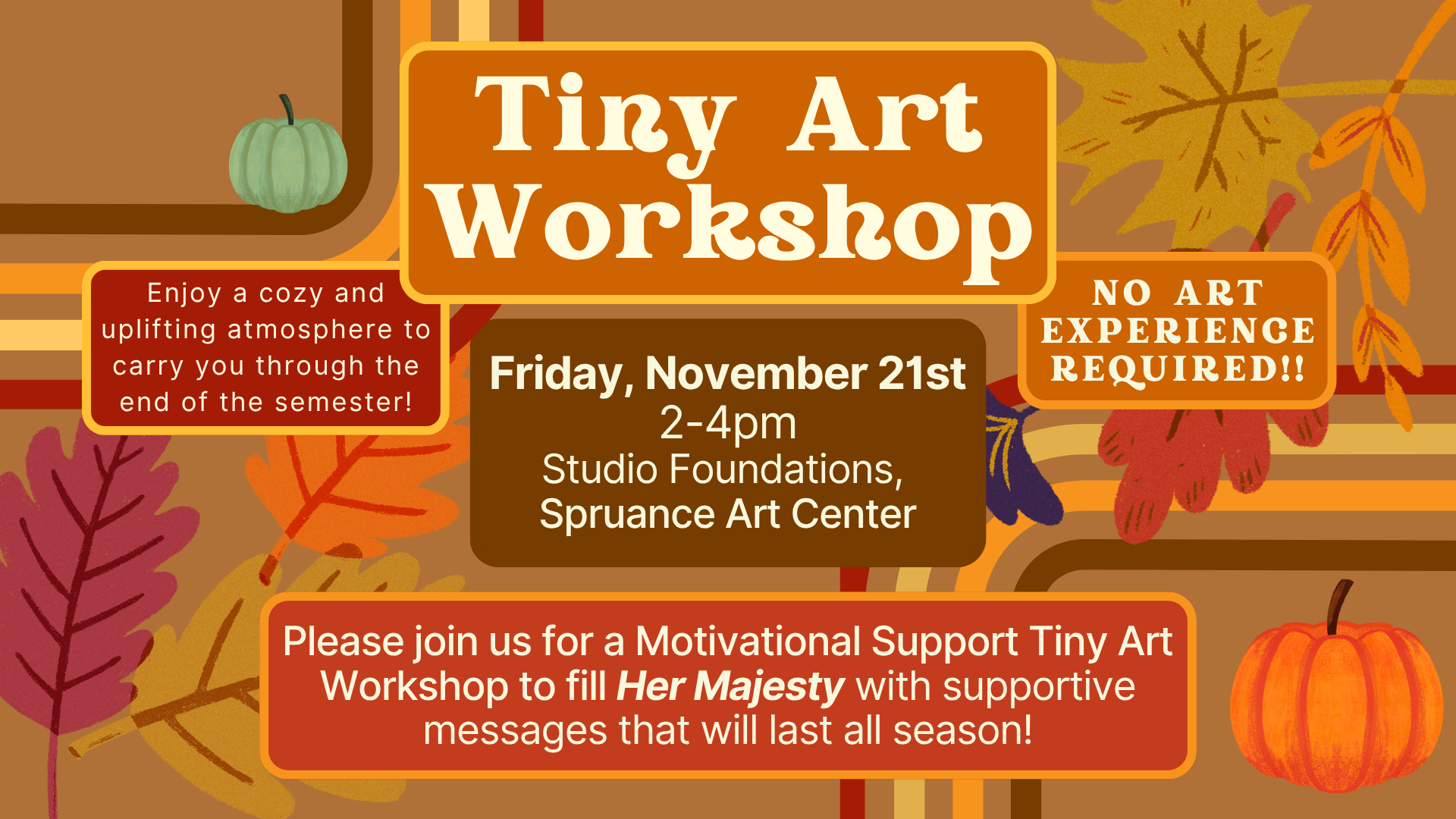 Please join us for a Tiny Art Workshop focused on Motivational Support to fill Her Majesty with supportive messages that will last all season. All materials provided You bring: Cozy vibes and positive attitude. No experience required!