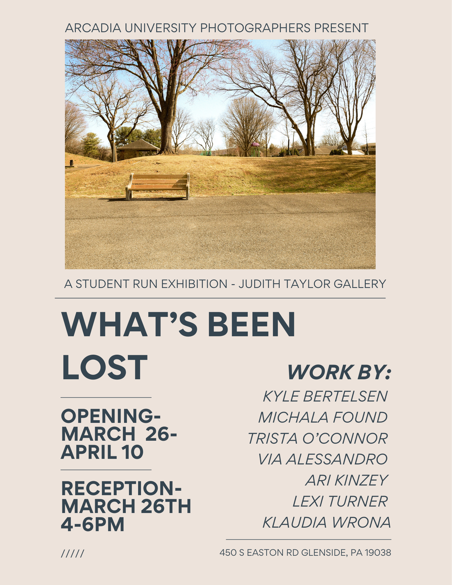 Please join Arcadia University Photographers for the Opening Reception of What’s Been Lost, On Thursday March 26th, from 4-6pm in the Judith Taylor Gallery, Landman Library, lower level.