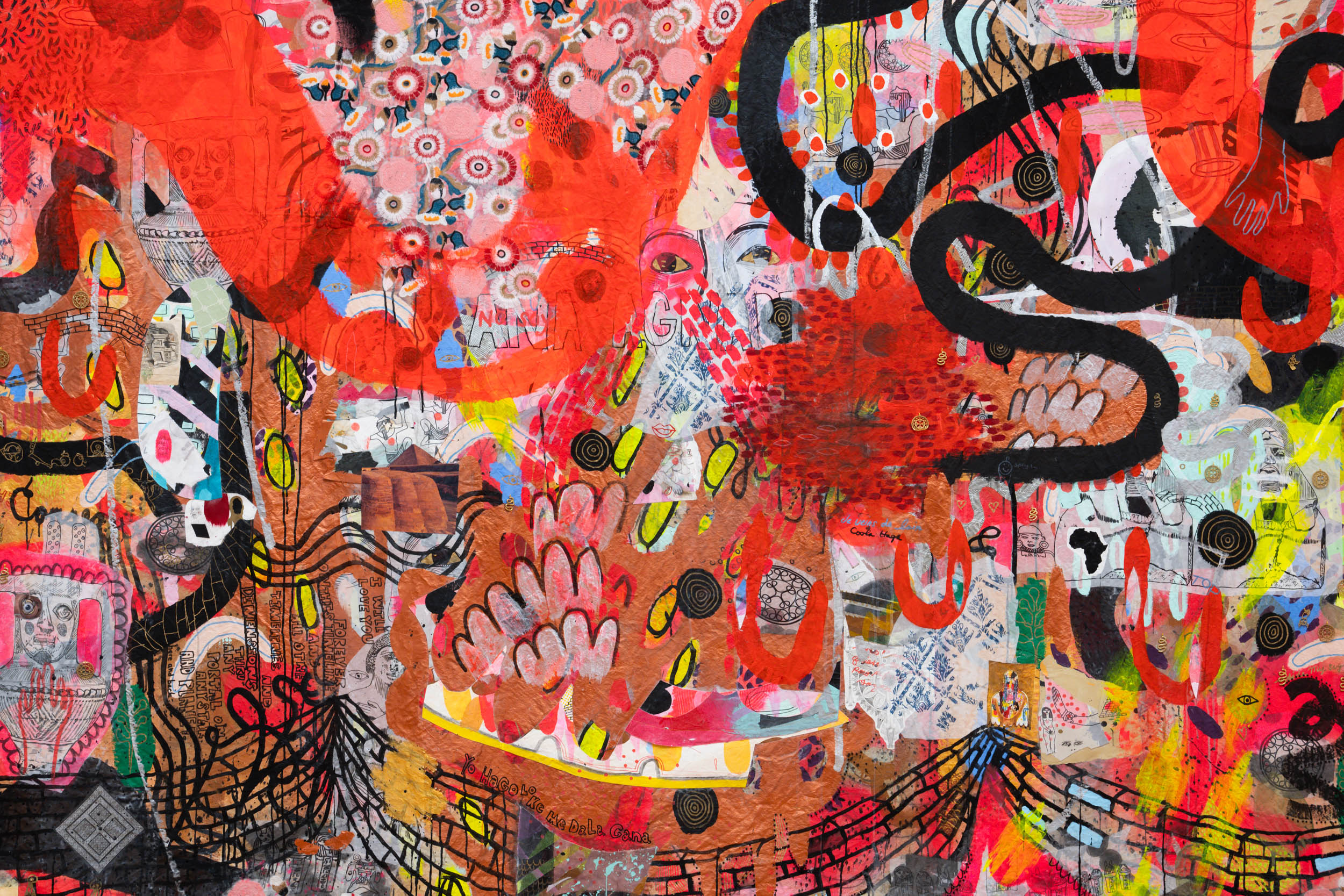 Jackie Milad’s artworks represent a collision of contemporary life and ancient Egyptian culture. An American artist of Honduran and Egyptian descent based in Baltimore, Milad creates monumental canvases that draw from her deep research of Egyptian antiquities at historic sites and in Western collections. She builds her paintings with layers of wildly colorful, abstract marks, personal imagery, pop culture references, and her drawings of Egyptian artifacts. Milad’s collaged paintings teem with life and Day-Glo colors, as she explores and reclaims the complicated histories around these antiquities. Her artworks act as interlocutors, in dialogue between the past, present, and future surrounding her Egyptian heritage and diasporic identity.