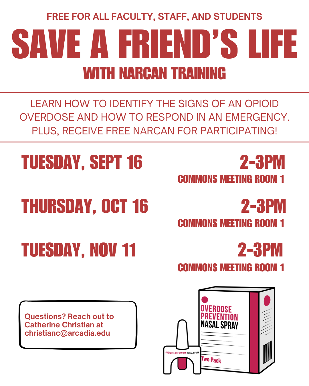 We have partnered with Montgomery County's Office of Drug and Alcohol Prevention to bring FREE Narcan training to students, faculty, and staff at Arcadia. This training will help participants identify the signs of an opioid overdose and how to respond in an emergency by administering Narcan (naloxone). Plus! All participants will receive free emergency preparedness kits with Narcan included!