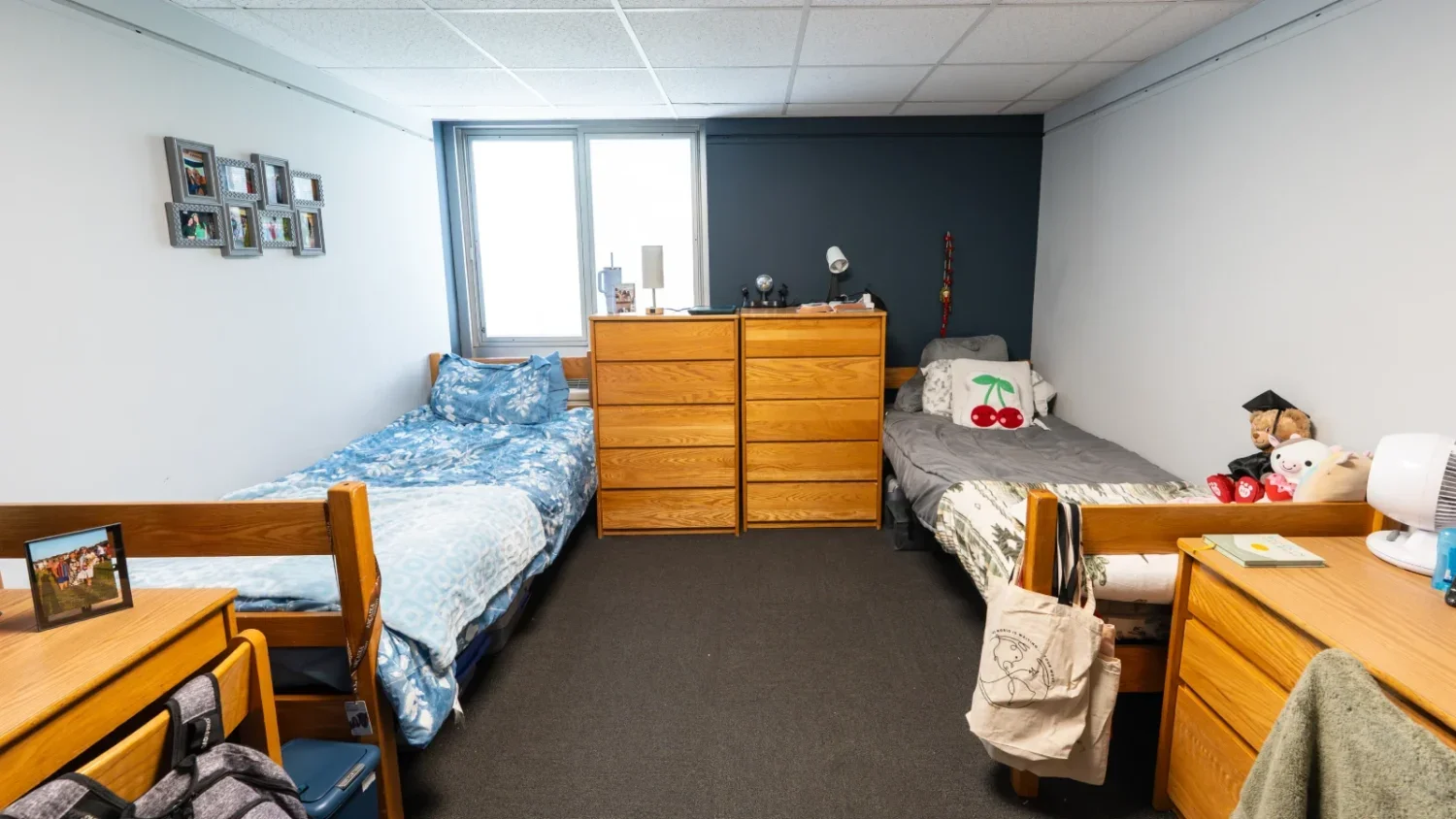 A bright and cozy double room on Kistler Hall’s third floor, featuring elevated views of campus life.